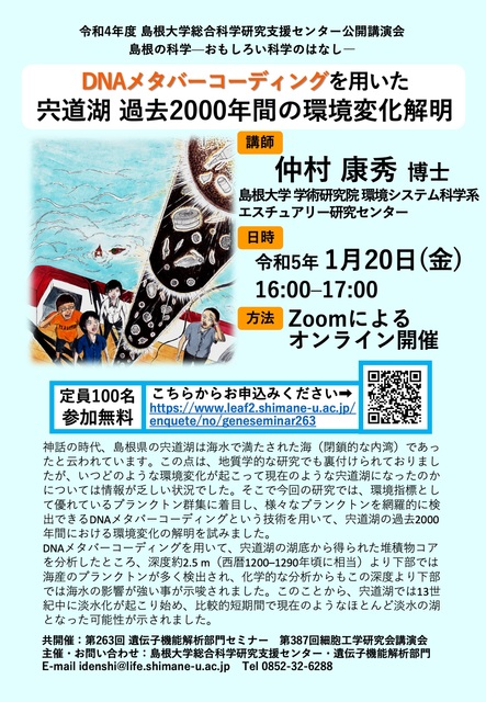 下記のとおり、島根大学総合科学研究支援センター主催で公開講演会「DNAメタバーコーディングを用いた 宍道湖 過去2000年間の環境変化解明」を開催いたします。